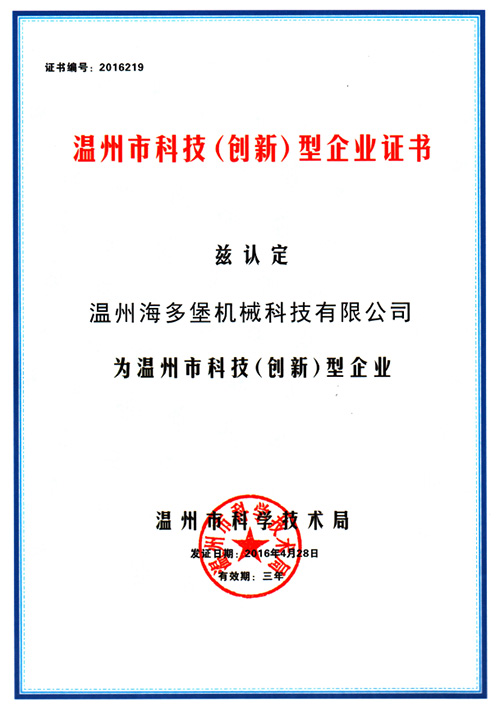 溫州海多堡機械科技,于2016年被認定為溫州市科技(創(chuàng)新)型企業(yè),同時授予溫州市科技(創(chuàng)新)型企業(yè)證書。